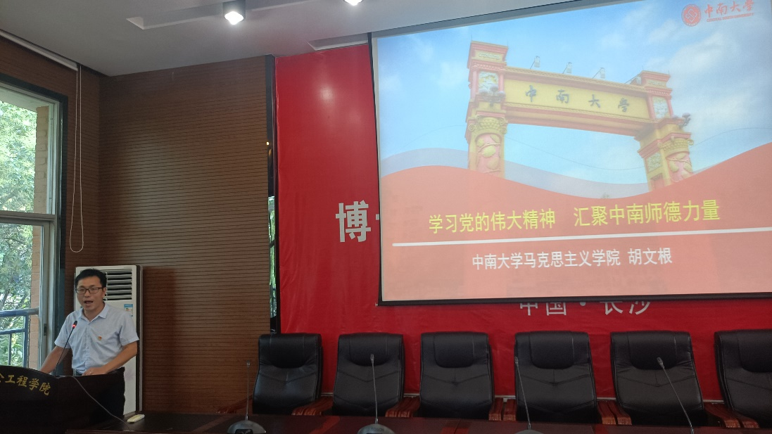 胡文根老师以《学习党的伟大精神,汇聚中南师德力量》为主题开展师德专题教育党课。党课主要围绕“从波澜壮阔的百年奋斗中把握党的伟大精神;从跌宕起伏的时代巨浪中把握党的伟大精神;高校师德建设需从党的伟大精神中汲取力量”三方面展开。