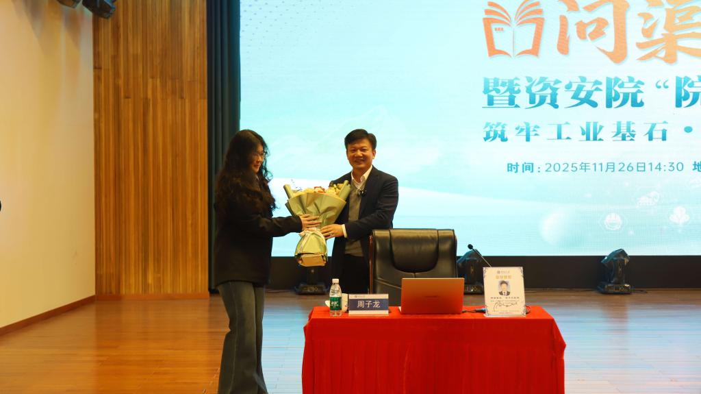 周子龙教授从矿业发展史出发,阐释矿产资源在人类文明进程中的重要地位,生动说明矿业作为“工业之母”对现代经济体系的基础支撑。围绕矿业的战略意义,他着重强调了矿产资源是国家经济命脉与国防安全的基石,进一步分析了稀土、锂、钴等关键矿产在国际竞争中的战略地位。同时,周子龙教授深入剖析了矿业转型升级的必然路径,讲述现代矿业正在走向一条更安全、更绿色、更智能、更可持续发展的道路。特别回顾与介绍了老一辈矿业开拓者的卓越贡献与当代优秀校友的实践成果,鼓励同学们要勇于担当新使命,展现新作为。
